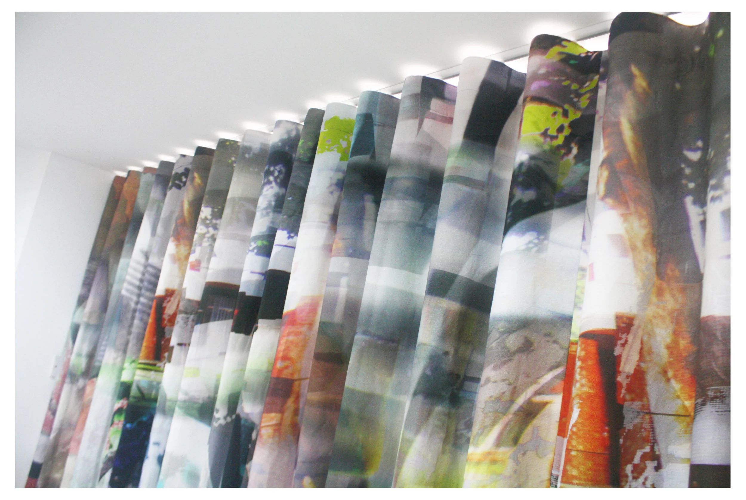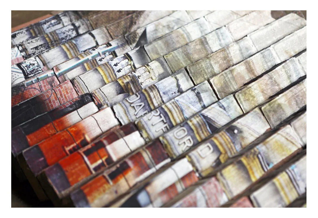 Clare created two installations for Dartford capturing the viewpoints and architecture of the town centre, titled Caving the View. Using photography, mono-printing and drawings of Dartford, Clare presented two large scale works making use of a lenticular process – allowing multiple images to be viewed from different angles. One of the installations is shown here as an interior piece for Holy Trinity Church using printed silk and brickwork. More information about the project can be followed in Clare’s blog.