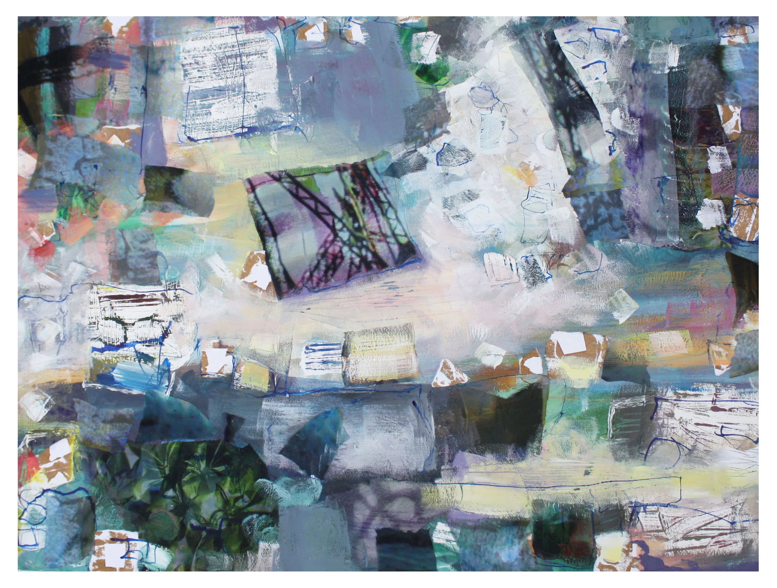 This abstract piece is painted on canvas using acrylic and collaged with printed silk and mono-printed paper.