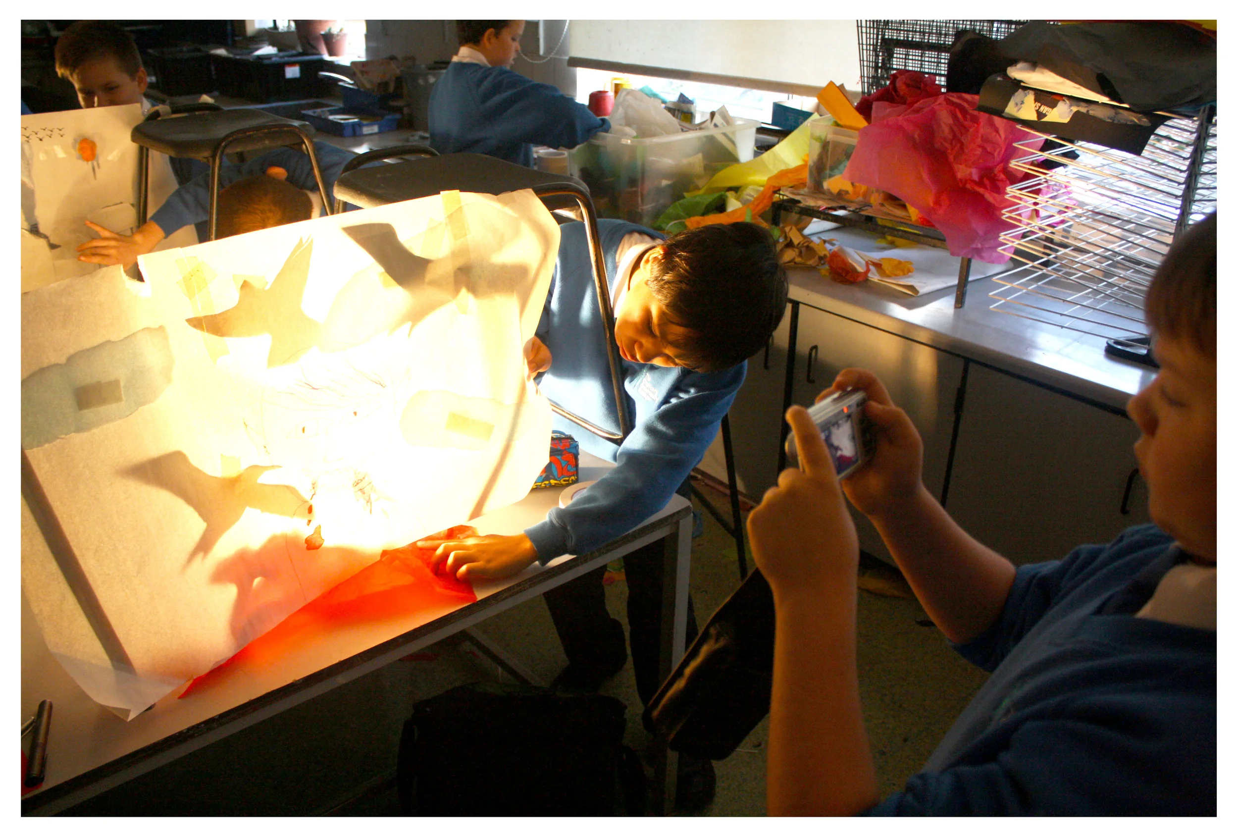 Here are some images from the year 6 session on creative photography. Students created digital imagery using a light box, translucent materials and digital cameras. The theme was based on futuristic school architecture and grounds at Manor Junior School. Following the photographic session, students worked in Adobe Photoshop Elements with their teachers to develop their imagery, adjusting brightness, contrast, colour and creating layers. Clare pre-recorded a ten minute video tutorial in Photoshop Elements for students to follow in their own time.