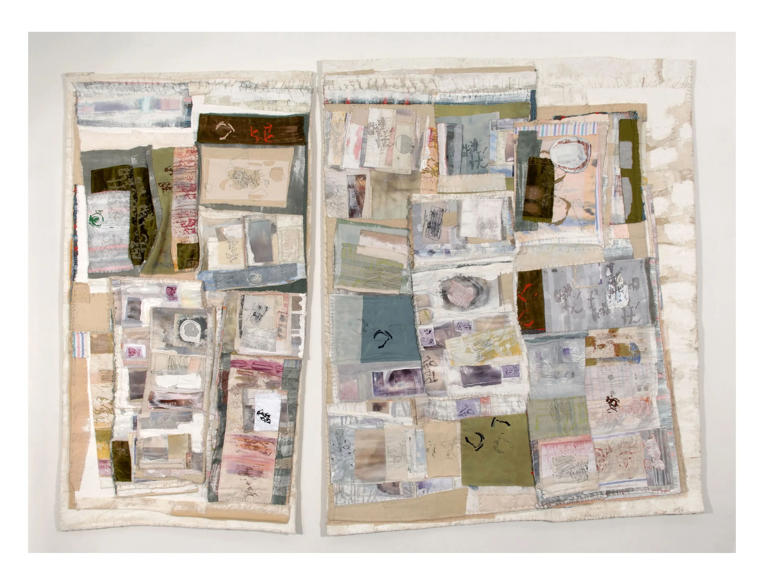 Textile hanging, mixed media quilt including screen print, paint, hand stitch, digital print, digital embroidery