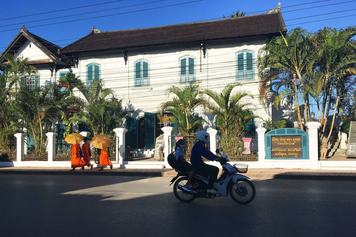 “After 45 minutes the city starts to be revealed. I sit on a wall and rest, the weight of my rucksack released for a moment. I gulp water and watch the anonymous, robed monks walk by, captured here in the photo. Their orange fabric lit by the sun, in perfect contrast to the sky. Complimentary colours in action. Laos cast its spell and lingers still.