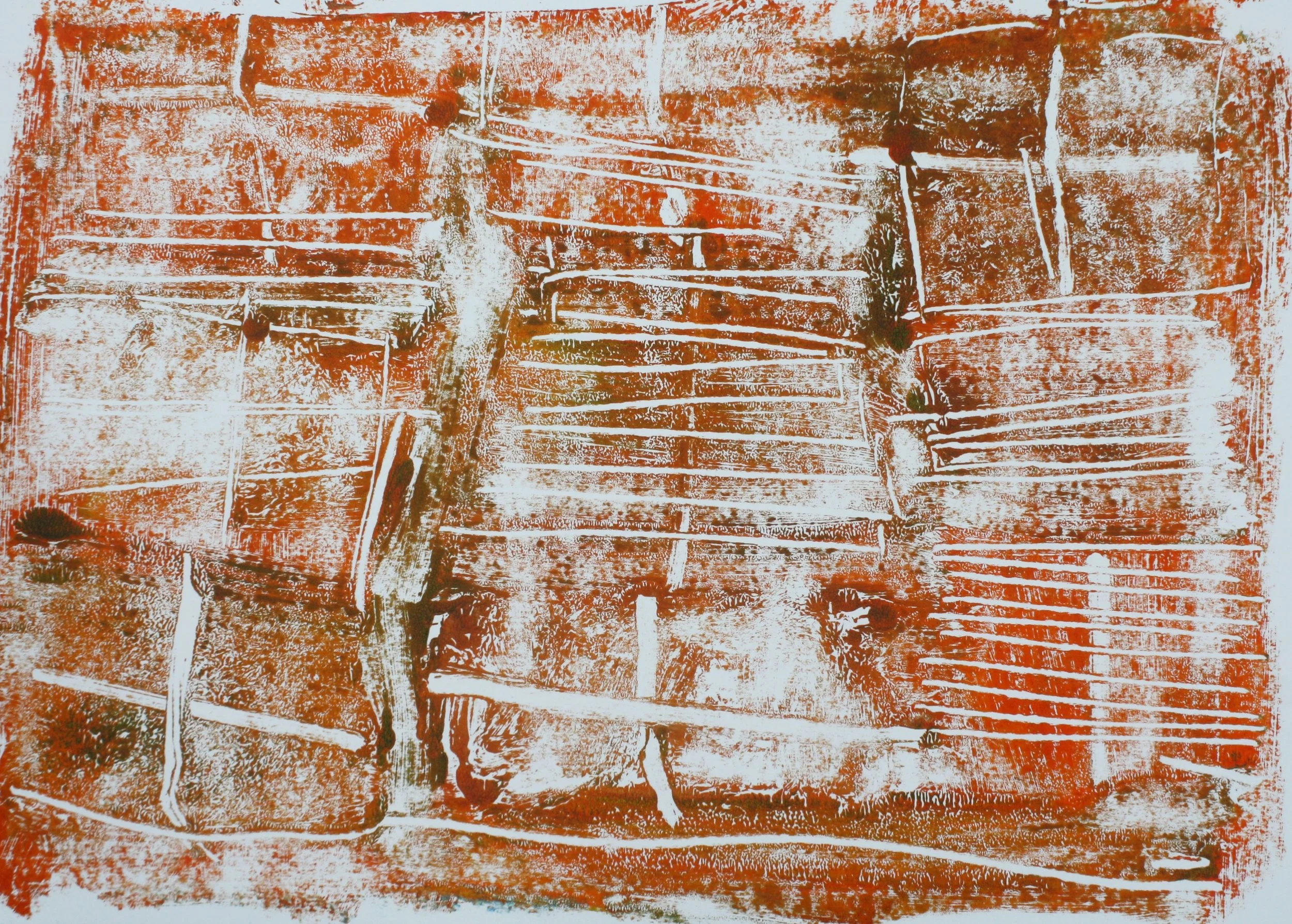 A sheet of paper is laid on top of the painted glass and even pressure applied to transfer the paint to paper. I’ve been using a lovely Fabriano printmaking paper 285gsm which absorbs the ink well. For a successful print, it’s a combination of the right amount of ink (paint), clear, dynamic marks and the right amount of pressure for the paper/fabric being used. All this needs experimentation, lots of trial and error. The white areas in the print below suggests I could have added more ink or pressure to get a little more detail in the image. This print feels more like a suggestion of the straw roofed house rather than a direct representation.