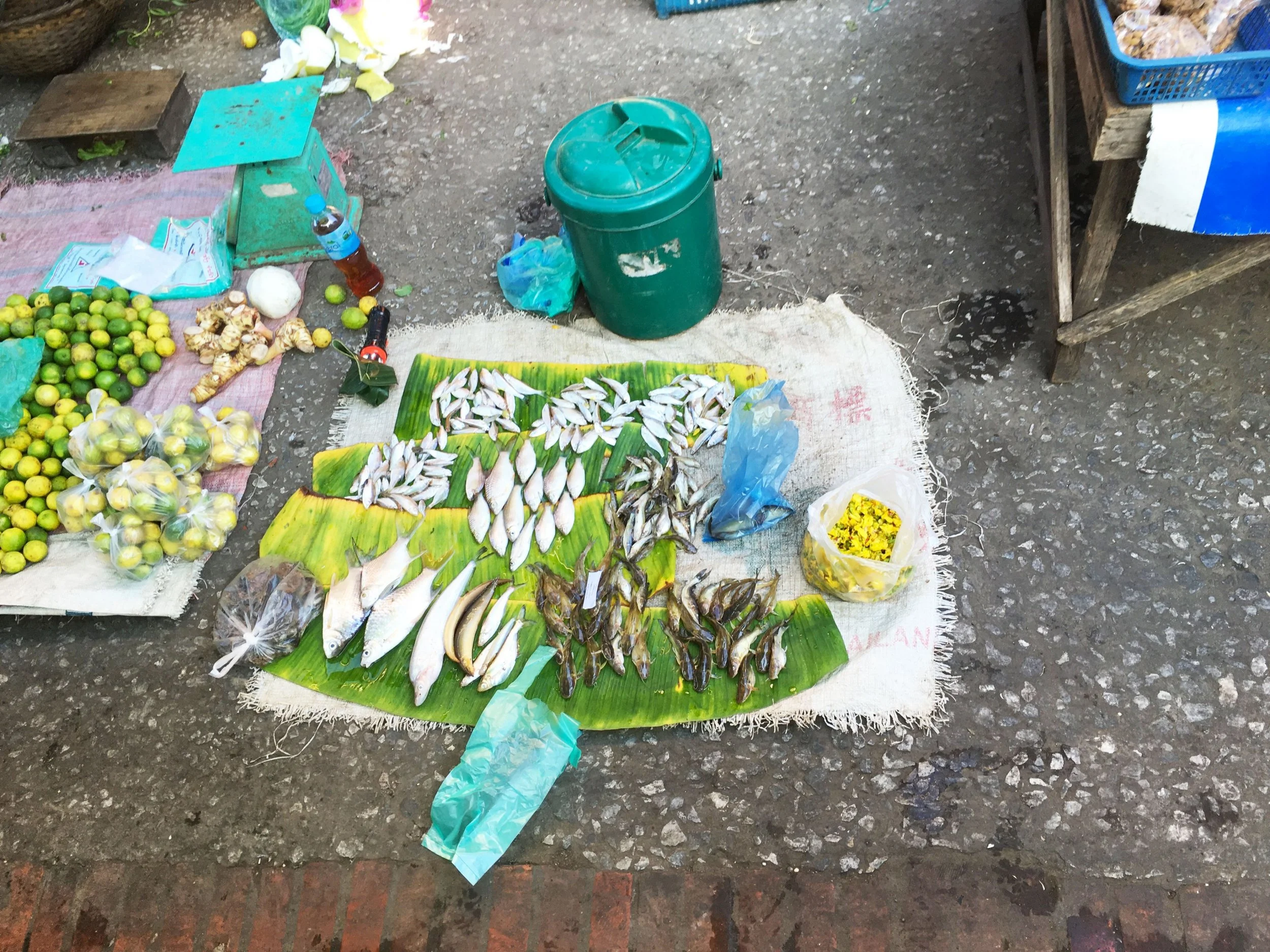 The daily food market in Luang Prabang, an inscrutable variety on offer, I was feeling shy to photograph too much. But fish – I know fish and the stall holder wasn’t looking. I loved the careful display of size and shape of these little fishes. Their white-silver colours shining above the fresh green of the palm leaf where they lay.
