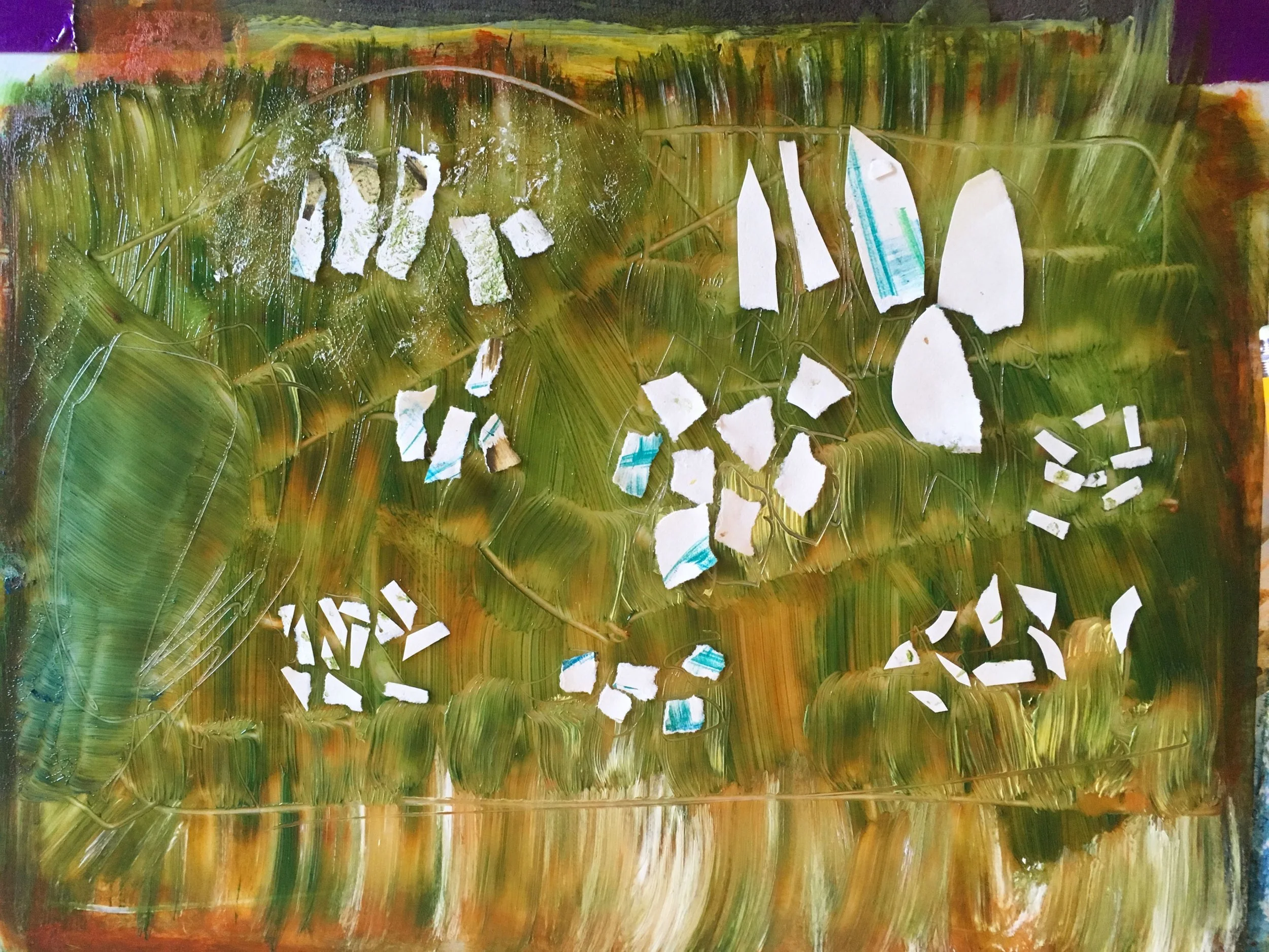 With the white in mind, I’ve decided to use some paper stencils when tackling this print. Tearing and cutting pieces of paper to lay on the painted glass panel. The paper arranged to mimic the groups of fish seen in the photograph. The white paper acts a resist to the paint when the paper is applied.