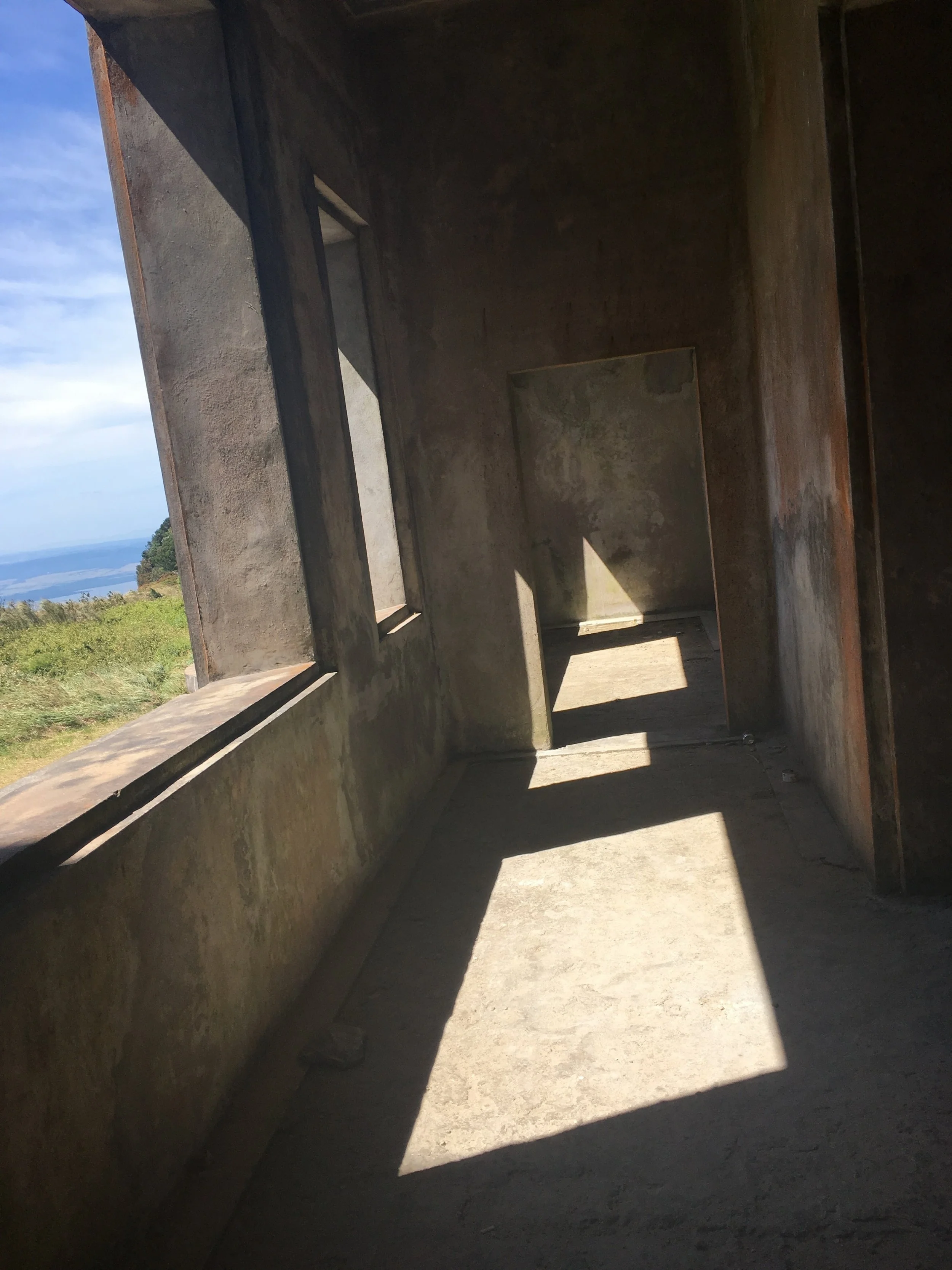 With the concrete exposed, the building’s bones revealed and unadorned by past fashions, I think of works by Rachel Whiteread. Impressed upon by these volumes of concrete in the building, my eye seeks to invert the solid surroundings, turn them inside out, become disorientated by merges of volume and negative space. It feels similar to the uncanny of Whiteread’s house and stairs, the familiar and the alien at meeting point. I become aware of a certain grief, nausea or ache of something long gone. This place saw opulence, violence and lastly abandonment. A range of experience fixed in the walls. My feelings perhaps heightened by the altitude, the windswept walking and general fatigue. I roam to the top floor, seeking the more optimistic sunshine. There are no plaques or audio guides to navigate and ground the visitor. So we are left to project our own demons or dreams, beware your frame of mind entering this place. The effect here would be lessened in a grey, muted climate. It is the very physical movement between light and dark, the high contrasts that makes you dizzy. I blame too much Hitchcock and episodes of The Prisoner for my own fate here.