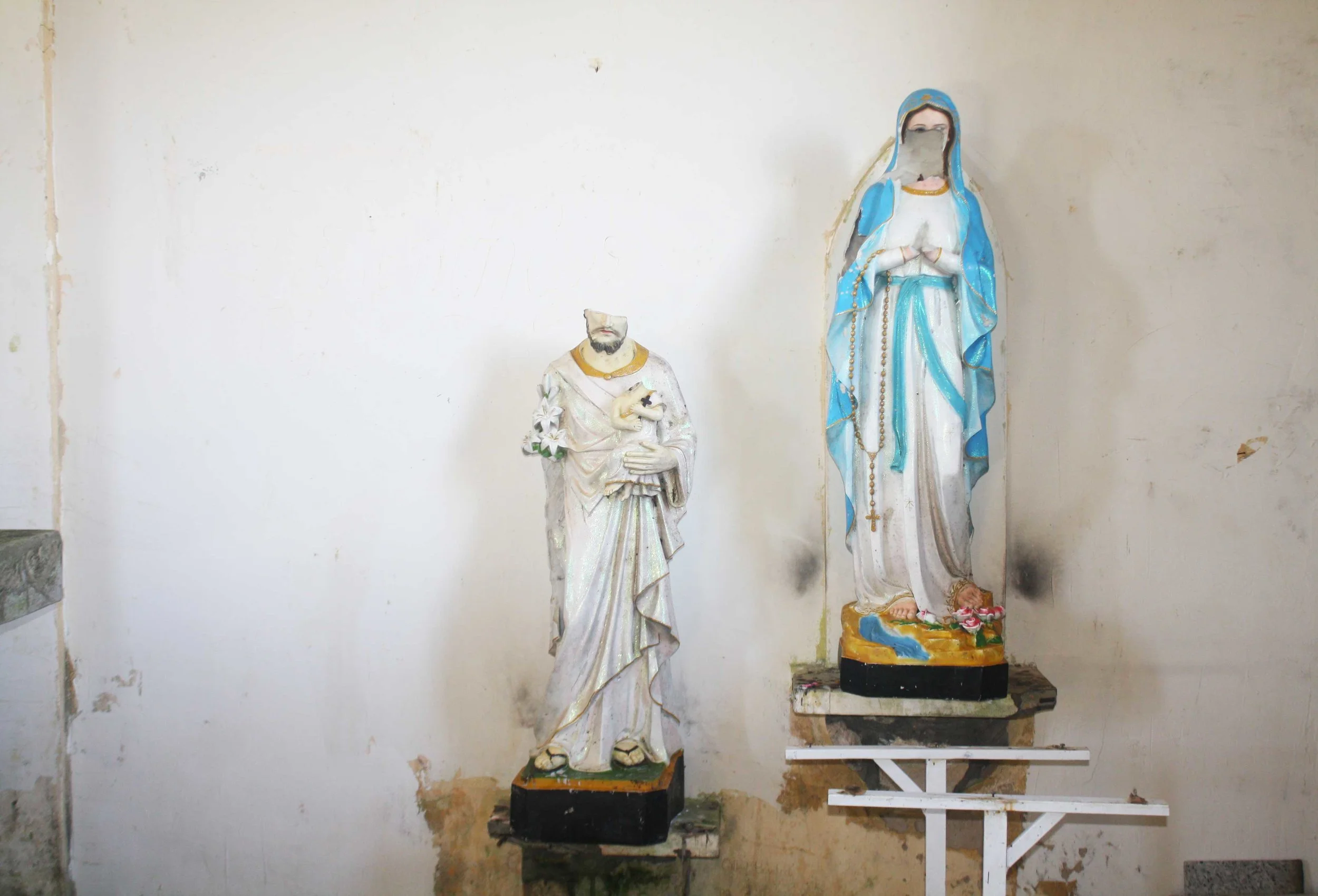 I return to memories of Bakor mountain for this theme of presence. Another seemingly abandoned space, this time, the old Catholic Church along the road from the old casino. Although stripped of most furniture and decoration familiar to most Catholic Churches, a few symbolic touches remain. Amid the quiet are the figures of Jesus, Mary and Joseph. Who would not be saddened by their broken, absent faces, in sharp relief against the whitewashed wall. Their presence remaining strong, however threatened by graffiti and debris.